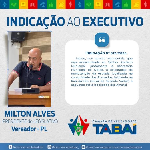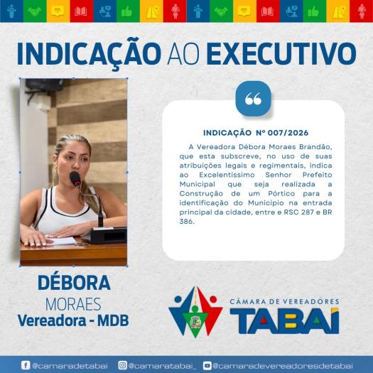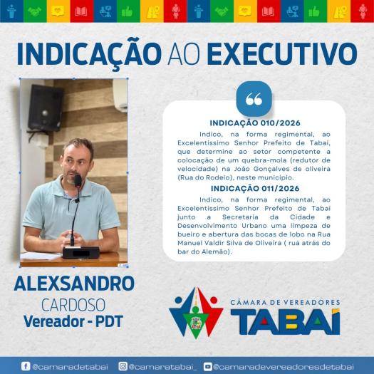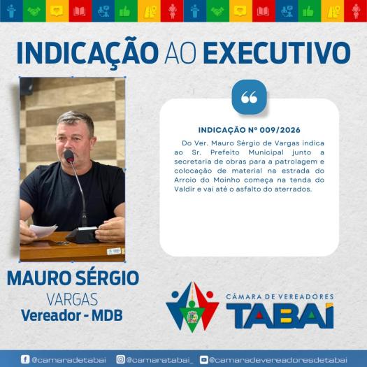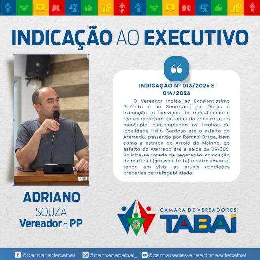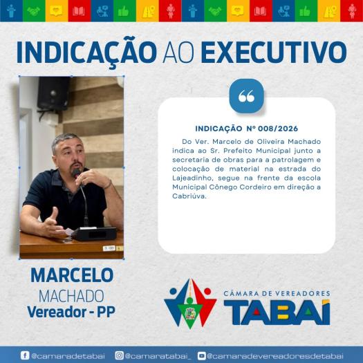 Na última sessão ordinária (18/02/26) da Câmara de Vereadores de Tabaí, foram encaminhadas ao Executivo Municipal as seguintes indicações: